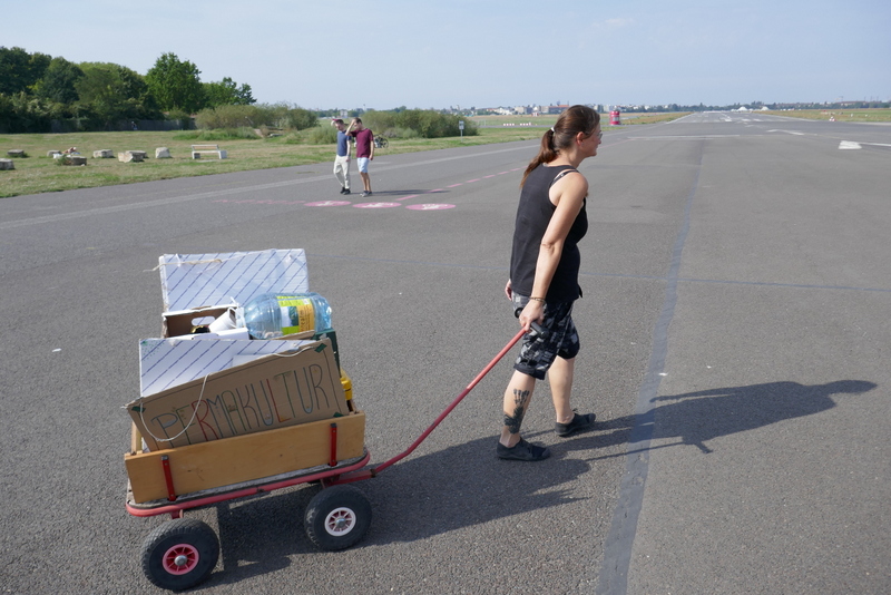 Tempelhofer-Feld-Erfahrende kennen die Herausforderung: Es darf nichts in den Boden gebohrt werden. Keine Zeltstangen, keine Heringe – nichts. In den letzten Jahren versuchten wir unsere Tarps mit allem Mitgebrachten zu fixieren und zu spannen: Fahrräder, Rucksäcke, Wasserflaschen. Doch der Wind auf einem Flugfeld ist ein anderer.