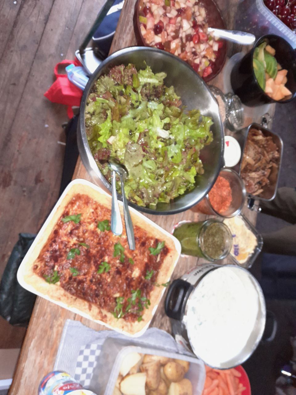 Ab dem Vormittag liefen die Vorbereitungen auf Hochtouren: Zusammen wurden am Küchenmobil gerettetes Obst und leckere Tomaten aus der SoLaWi geschnippelt und der frisch aus dem Gemeinschaftsgarten geerntete Salat ließ das Wasser im Munde zusammen laufen. Ergänzt durch zuhause vorbereitete Gerichte und die mitgebrachten Beiträge der Gäste entstand schnell ein reichhaltiges Buffet. Ein zusätzlich aufgebautes Dach bot Schutz für die Abwaschschüsseln.