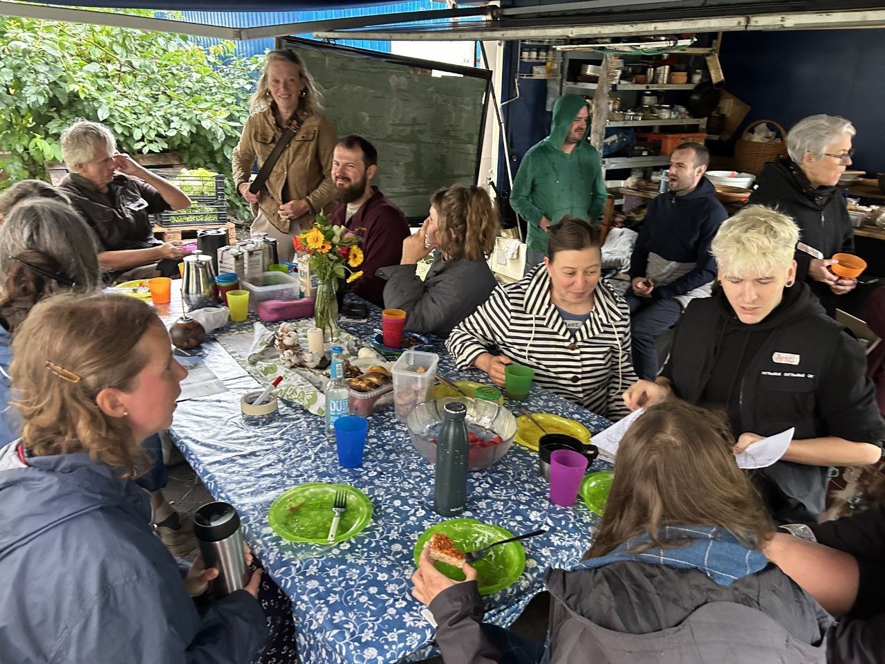 Ein dunkel grollender Himmel und wahre Regenfluten hielten mehr als 20 Menschen nicht davon ab, sich am ersten Sommer-Samstag im Juli in gemütlicher Picknicklaune im KEBAP-Gemeinschaftsgarten zu treffen. Mit wärmenden Decken haben sie sich unter dem schützenden Dach des Küchenmobils intensiv über die Vielfalt der Permakultur ausgetauscht. Beim Essen des reichhaltigen Buffets entstanden neue Verbindungen und am Ende wurde es beim gemeinsamen Aufräumen noch ein wunderschöner trockener Abend mit sonniger Stimmung!