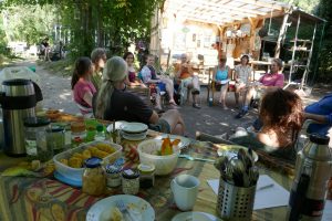 So kam es, dass wir an einem wirklich heißen Tag geschützt im lichten Halbschatten der Bäume sitzen und uns mit rund 15 Menschen über Permakultur austauschen konnten. Überrascht wurden wir vom Besuch von Antja Kennedy, der Tochter von Permakultur-Pionier Declan Kennedy. Es war mir eine große Freunde, mit ihr gemeinsam ganz spontan den obligatorischen „Was ist eigentlich Permakultur“-Blitzeinstieg machen zu können! Danke Antja für diese Erfahrung!